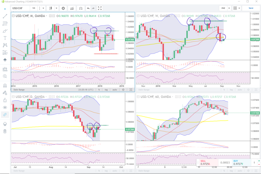 The USDCHF shows us a horizontal resistance line on the monthly chart (top left) with bearish patterns confirming the resistance. The latest confirmation being the bearish engulfing candle that took out three candles the preceding months.