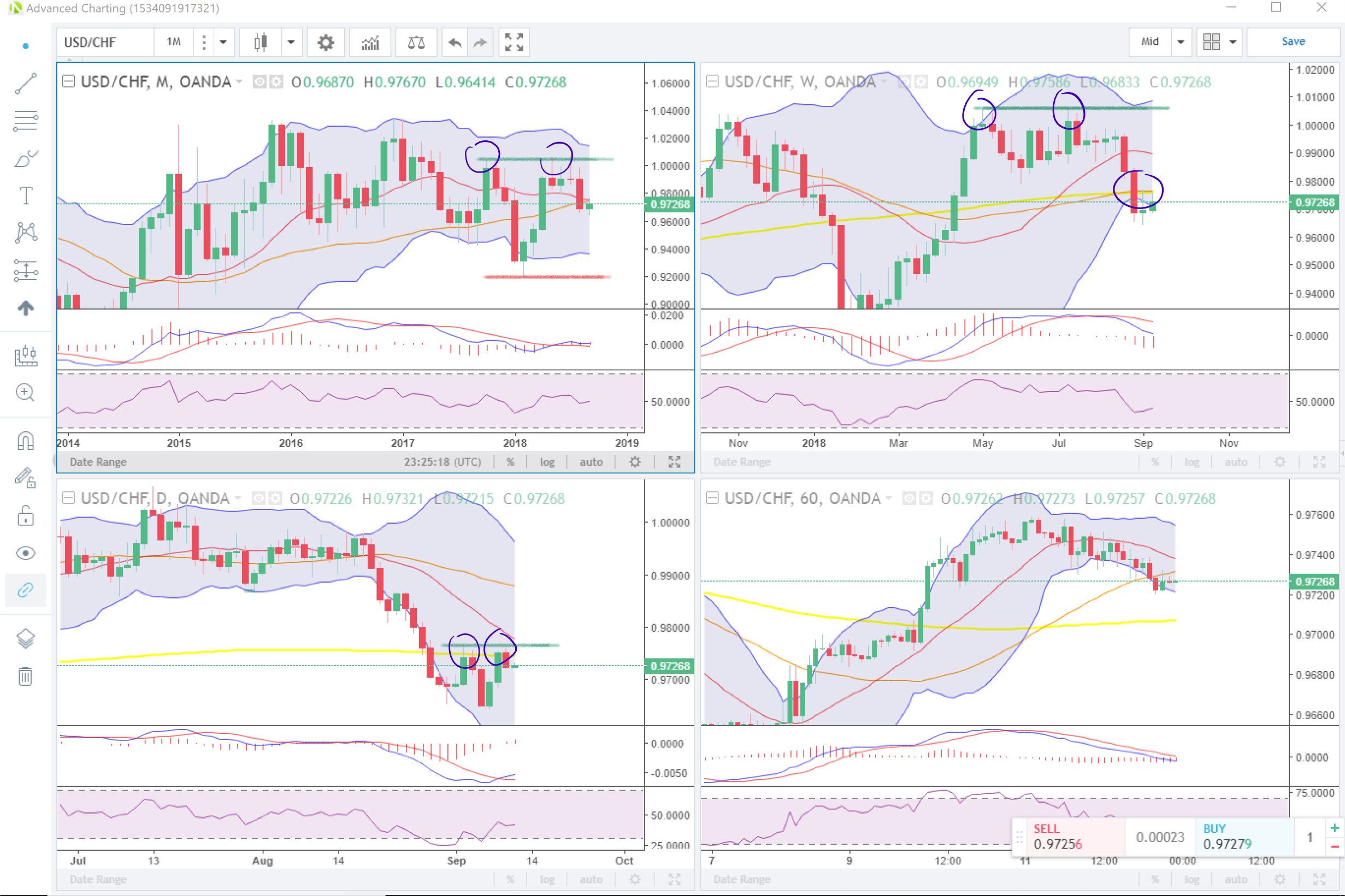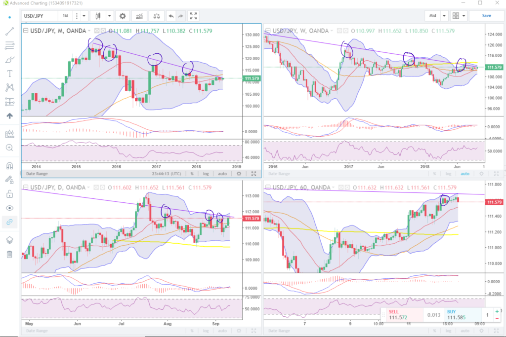 Looking at the USDJPY price action we see that on the monthly chart (top Right) there is a descending resistance line that the price consistently tests.. This is further proven by the weekly (top left) and daily (bottom right) charts.
