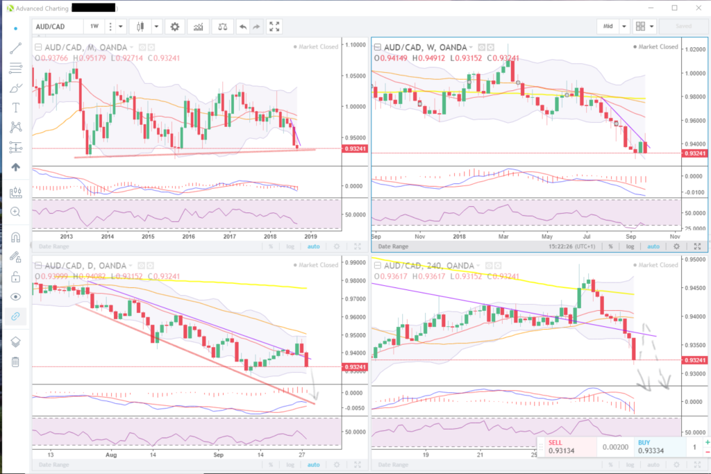 The AUDCAD pair appears to be at support on the monthly chart so we could see a bounce to the upside or a break downward. If there is a break to the downside below the current price level, I would look to initiate a short position using the support line as new resistance. If there was a bounce, I would wait for confirmation by way of bullish patterns. The daily and H4 charts show negative movement which could be a good opportunity to jump in to the downside bearing in mind the aforementioned.