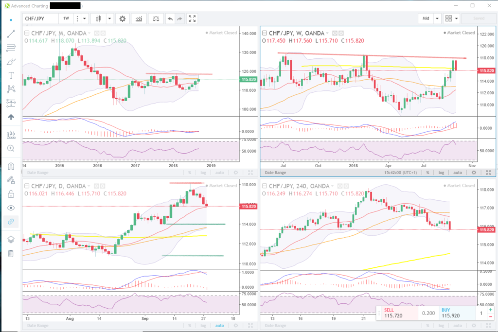 The CHFJPY shows a shooting start candle pattern at the resistance level around the 118.00 area which has been tested two times prior. We can see this clearly in the weekly chart. The H4 TF shows a bearish crossover of the 20 below the 50 moving averages, I would look for a retest of the highs before attempting an entry to the downside..